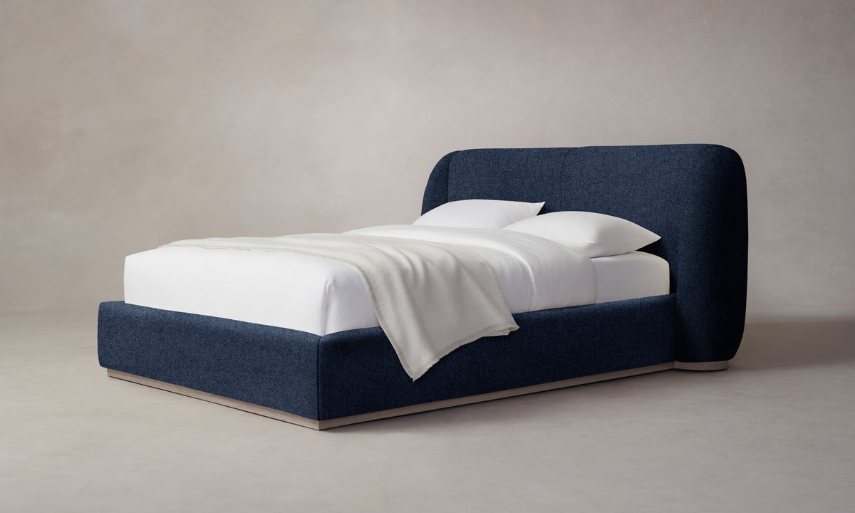 With its voluminous form and sweeping curves, the Smith Bed is a statement piece for the bedroom. Its enveloping shelter headboard and frame are fully upholstered and set upon a plinth base. Handcrafted in North Carolina.