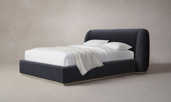 With its voluminous form and sweeping curves, the Smith Bed is a statement piece for the bedroom. Its enveloping shelter headboard and frame are fully upholstered and set upon a plinth base. Handcrafted in North Carolina.