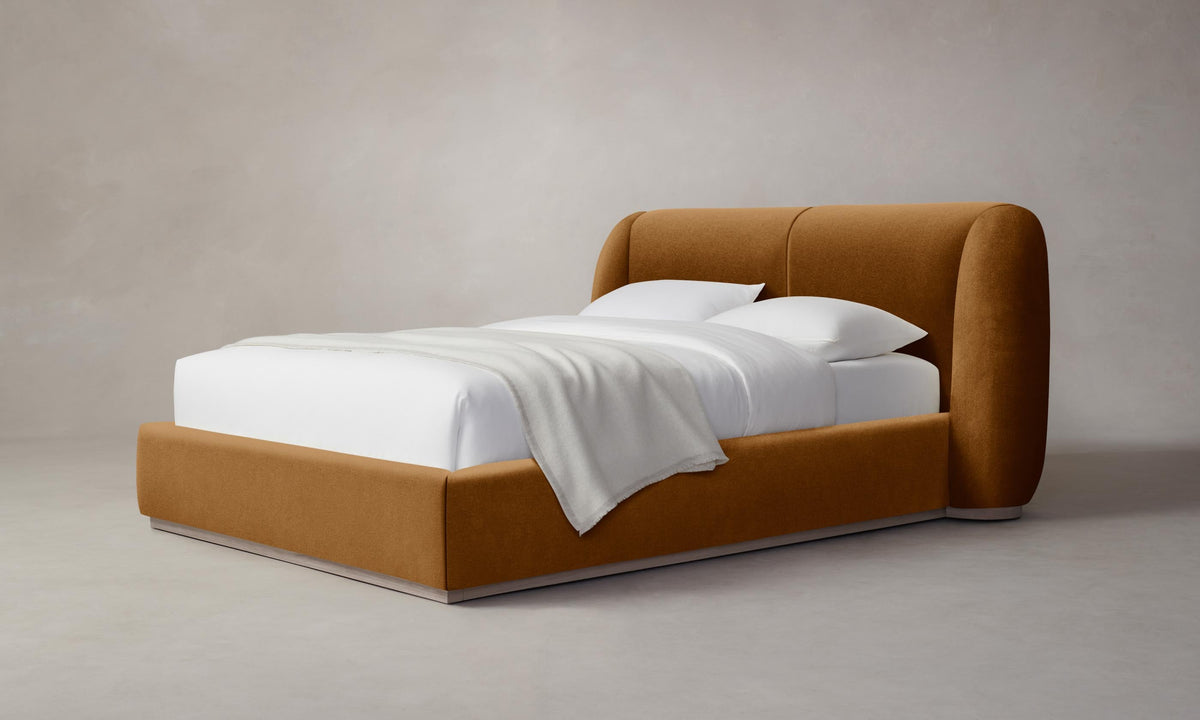 With its voluminous form and sweeping curves, the Smith Bed is a statement piece for the bedroom. Its enveloping shelter headboard and frame are fully upholstered and set upon a plinth base. Handcrafted in North Carolina.