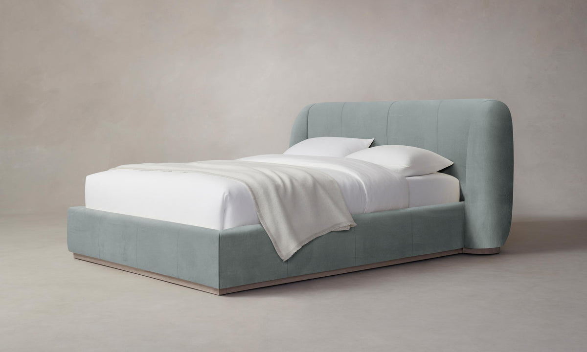 With its voluminous form and sweeping curves, the Smith Bed is a statement piece for the bedroom. Its enveloping shelter headboard and frame are fully upholstered and set upon a plinth base. Handcrafted in North Carolina.