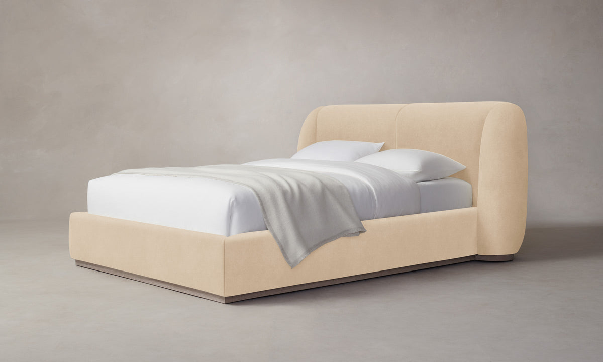 With its voluminous form and sweeping curves, the Smith Bed is a statement piece for the bedroom. Its enveloping shelter headboard and frame are fully upholstered and set upon a plinth base. Handcrafted in North Carolina.