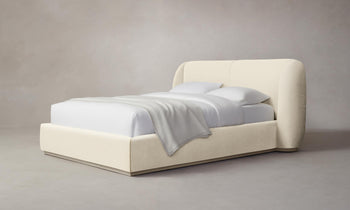 With its voluminous form and sweeping curves, the Smith Bed is a statement piece for the bedroom. Its enveloping shelter headboard and frame are fully upholstered and set upon a plinth base. Handcrafted in North Carolina.