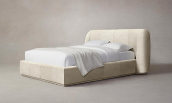 With its voluminous form and sweeping curves, the Smith Bed is a statement piece for the bedroom. Its enveloping shelter headboard and frame are fully upholstered and set upon a plinth base. Handcrafted in North Carolina.