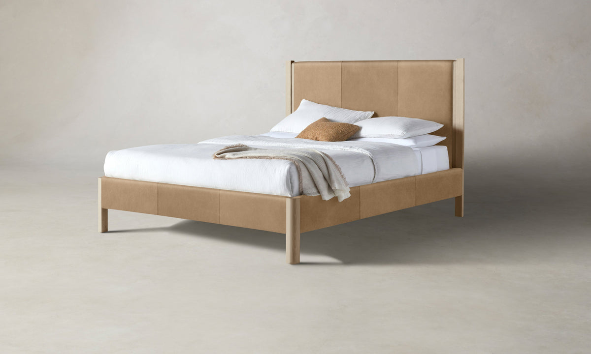 The Thompson Bed is an expression of graceful simplicity. It has an ash frame with rounded corners and neat upholstery along the headboard, foot rail, and sides, creating a perfect balance of rigidity and softness. Handcrafted in North Carolina.