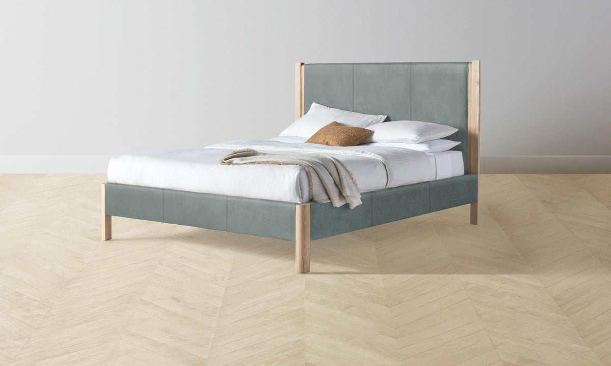 The Thompson Bed is an expression of graceful simplicity. It has an ash frame with rounded corners and neat upholstery along the headboard, foot rail, and sides, creating a perfect balance of rigidity and softness. Handcrafted in North Carolina.