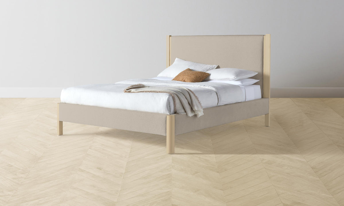 The Thompson Bed is an expression of graceful simplicity. It has an ash frame with rounded corners and neat upholstery along the headboard, foot rail, and sides, creating a perfect balance of rigidity and softness. Handcrafted in North Carolina.