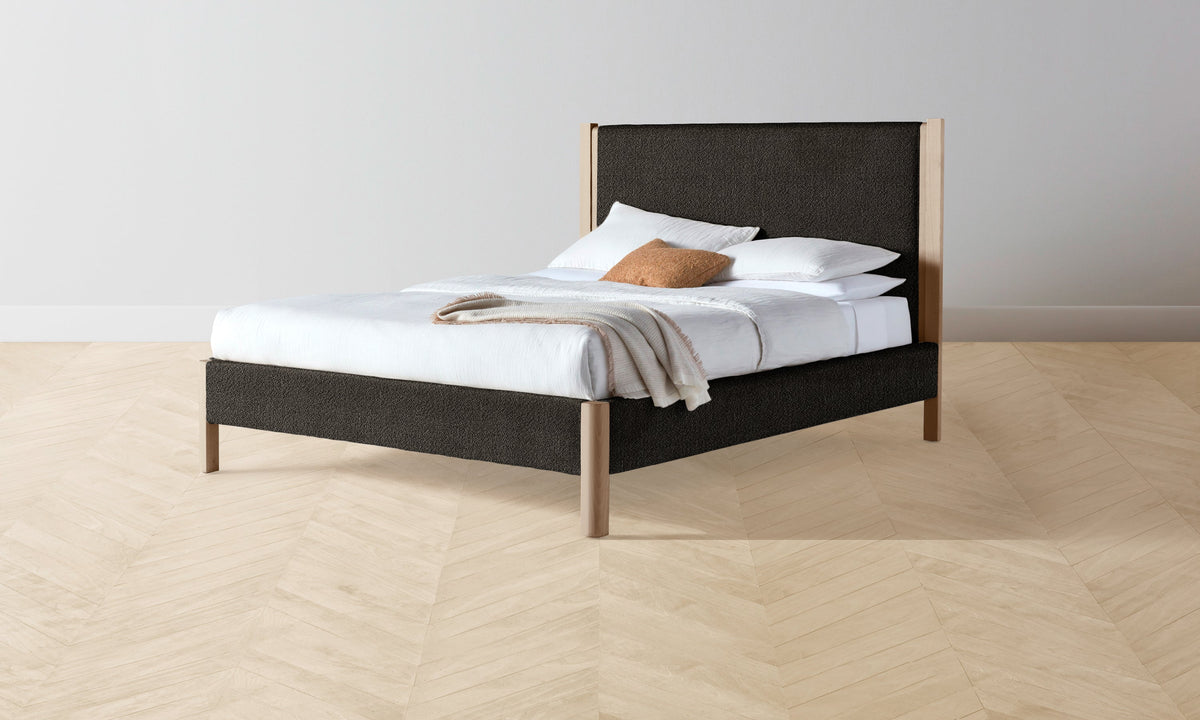 The Thompson Bed is an expression of graceful simplicity. It has an ash frame with rounded corners and neat upholstery along the headboard, foot rail, and sides, creating a perfect balance of rigidity and softness. Handcrafted in North Carolina.