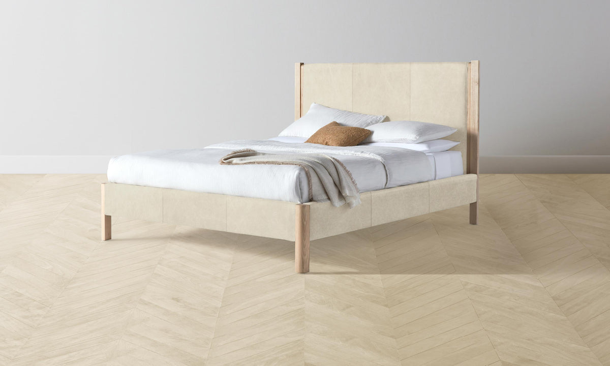 The Thompson Bed is an expression of graceful simplicity. It has an ash frame with rounded corners and neat upholstery along the headboard, foot rail, and sides, creating a perfect balance of rigidity and softness. Handcrafted in North Carolina.