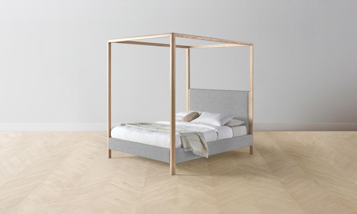 The Thompson Canopy Bed is an expression of graceful simplicity. It has an ash frame with rounded corners and neat upholstery along the headboard, foot rail, and sides, creating a perfect balance of rigidity and softness. Handcrafted in North Carolina.