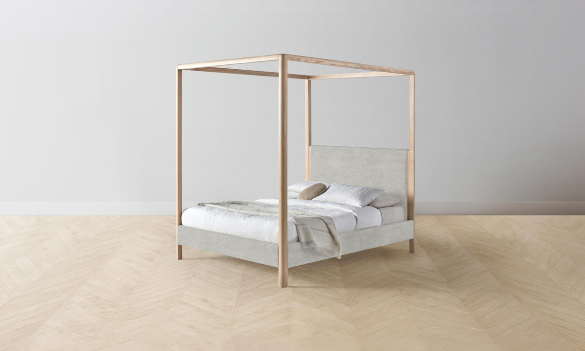 The Thompson Canopy Bed is an expression of graceful simplicity. It has an ash frame with rounded corners and neat upholstery along the headboard, foot rail, and sides, creating a perfect balance of rigidity and softness. Handcrafted in North Carolina.