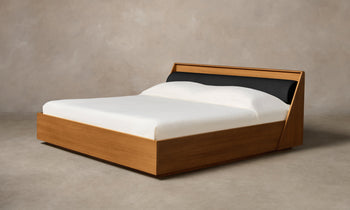 Rectilinear in form and rigid in materiality, the Verne Bed is a bold centerpiece for the bedroom. It has a white oak plywood frame and headboard accented with a contrasting bolster that adds a touch of softness. Handcrafted in New York.