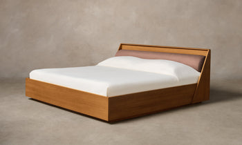Rectilinear in form and rigid in materiality, the Verne Bed is a bold centerpiece for the bedroom. It has a white oak plywood frame and headboard accented with a contrasting bolster that adds a touch of softness. Handcrafted in New York.