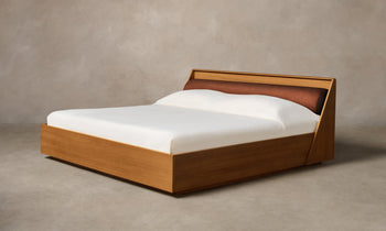 Rectilinear in form and rigid in materiality, the Verne Bed is a bold centerpiece for the bedroom. It has a white oak plywood frame and headboard accented with a contrasting bolster that adds a touch of softness. Handcrafted in New York.