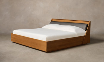 Rectilinear in form and rigid in materiality, the Verne Bed is a bold centerpiece for the bedroom. It has a white oak plywood frame and headboard accented with a contrasting bolster that adds a touch of softness. Handcrafted in New York.