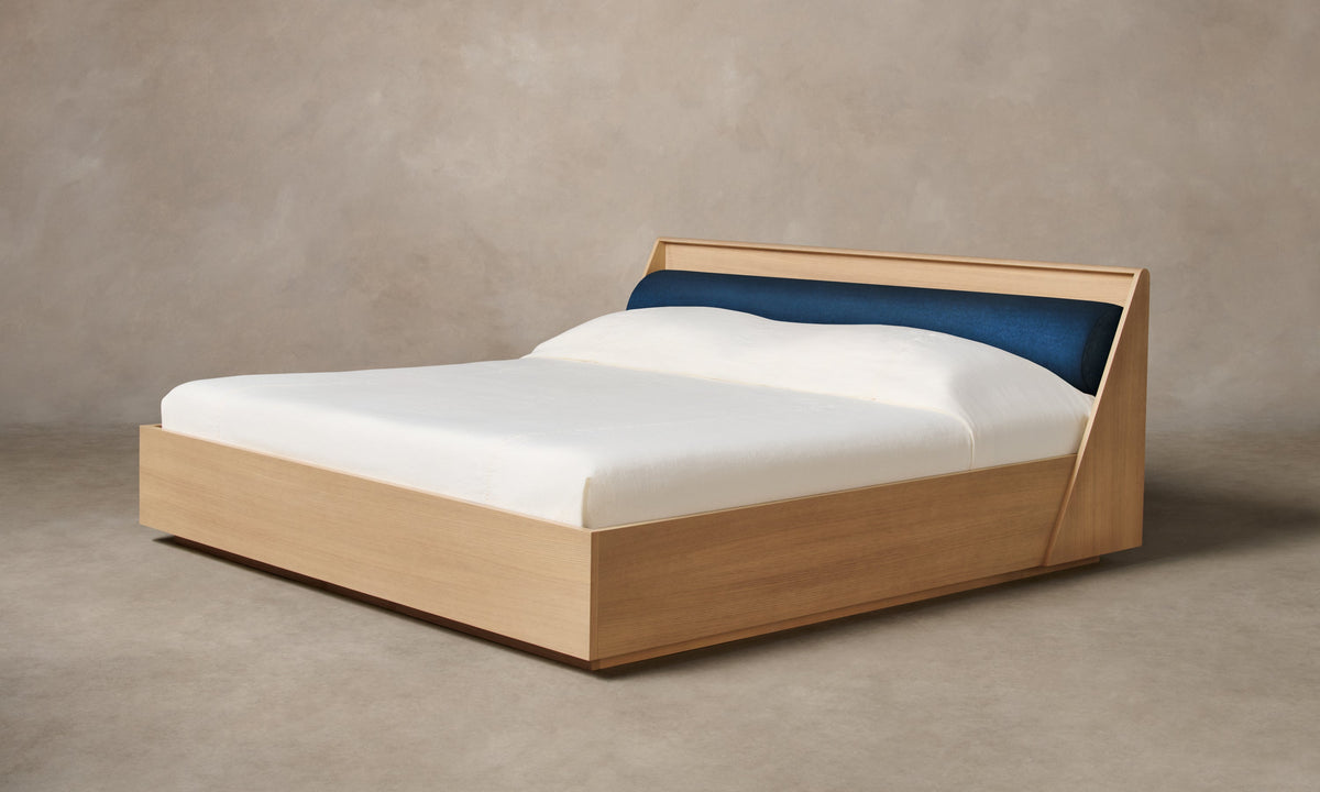 Rectilinear in form and rigid in materiality, the Verne Bed is a bold centerpiece for the bedroom. It has a white oak plywood frame and headboard accented with a contrasting bolster that adds a touch of softness. Handcrafted in New York.