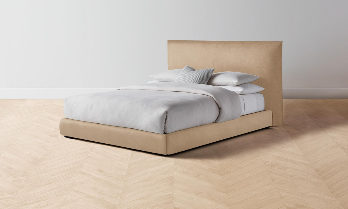 The Wythe Bed achieves a perfect balance of ease and sophistication. It features a laid-back, low profile and extended headboard traced with flange seams. Handcrafted in North Carolina.