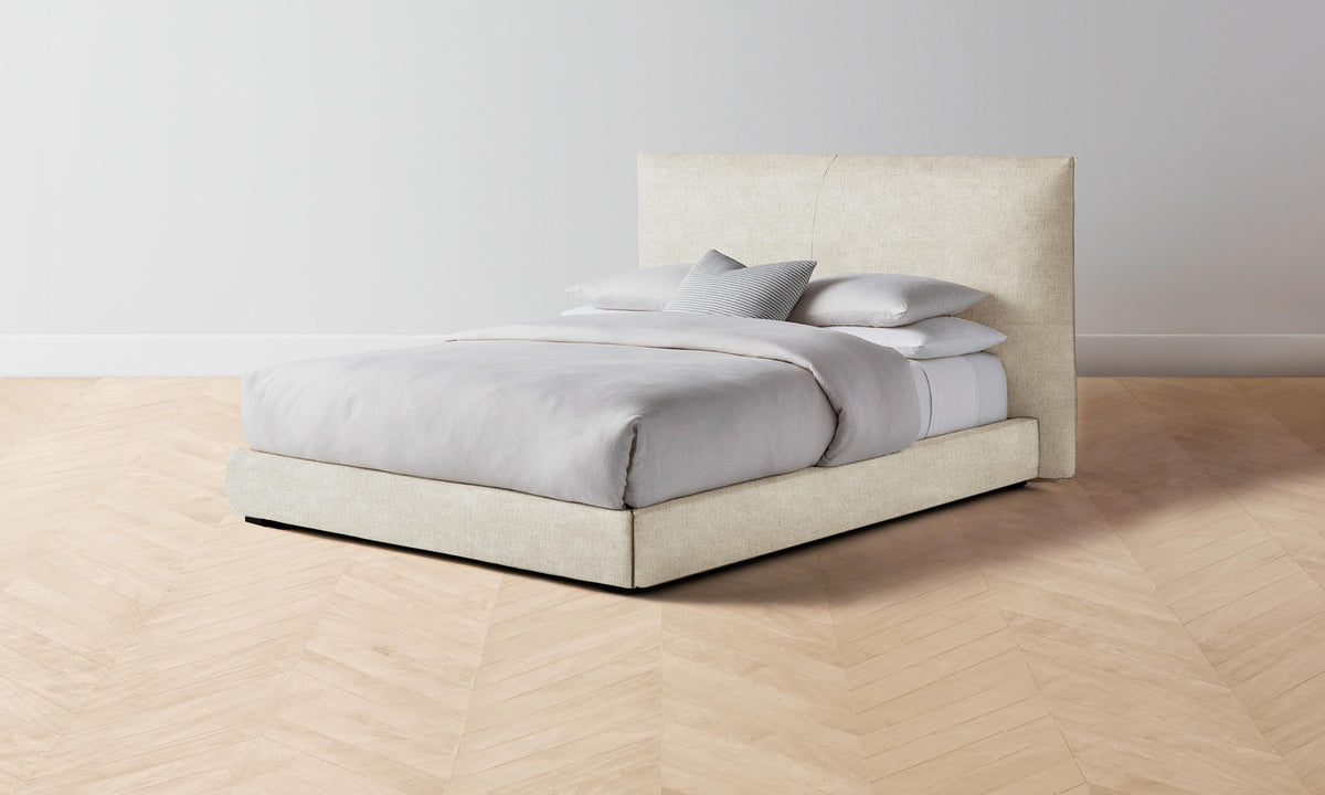 The Wythe Bed achieves a perfect balance of ease and sophistication. It features a laid-back, low profile and extended headboard traced with flange seams. Handcrafted in North Carolina.